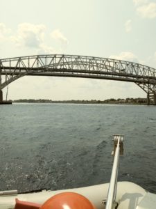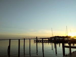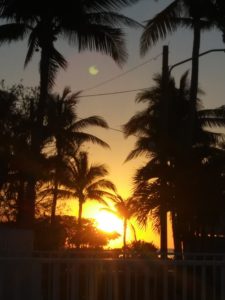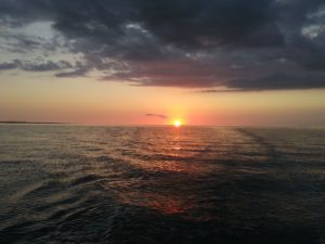 Besides looking for crab pots, we were also entertained by what we called “flying fish.” They would jump out of the water and appear to fly across the water by skimming the surface. Eventually the Seven Mile Bridge appeared, just a spec on the horizon for a very long time. Finally, as the sun began to set, we could see land! We arrived safely in Marathon, just as the sun set and the dark set in.