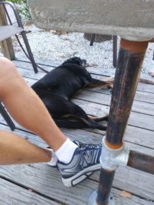 Heading on north, we pass through the Haulover Canal. Apparently it is manatee mating season, and there tons of manatee all over! We have to be really careful to navigate around the mating rituals. Ready for a good anchorage, we anchor in Mosquito Lagoon. While it is a fairly open body of water, the direction the wind is predicted to come from should give us some protection. It’s a beautiful spot, near the ocean and a great spot to take Rilee to shore. We spend the afternoon walking the beach, careful not to turn to the south, towards the senior nude beach…not a pretty picture. Rilee finds some turtles in the brush (don’t worry we didn’t let her get them!). We head back to the boat for the evening, where we spent the early hours getting rocked, and not gently to sleep. The wind shifted and the waves increased to 3 plus feet, not at all what was forecasted for the night. We left at first light and headed straight to New Smyrna Beach, where they had a free dock. We tied up to the dock and all three of us took a long nap. Waking up, there were fishermen on the dock, fishing over the boat. Afraid for our canvas, we decided to look for a marina for the night. Down at the city marina, while Chad is inside checking on availability, Rilee and I notice a boat drifting towards the marina. Someone on an adjacent fishing dock had tried to move a boat using a book hook, and it broke free. I let Chad know and he and some others ran down to avoid a collision. After all the commotion, we got a spot at the marina for the night.