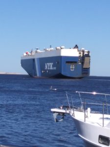 We depart on a rising tide, headed for Delaware City, DE. The marina there holds a daily briefing to prepare cruisers for the unique weather on the Delaware Bay. This bay is characterized by swift currents, exposed waters, and few places for a sailboat to duck out if weather turns poor. Weather looked good enough for an early morning departure down the bay. What started out as dead calm winds and water, turned quickly into a washing machine of nasty chop and strong winds. With no other option but to continue on, we decided instead of heading for Cape May, NJ we would shoot to the southern side of the bay and head towards Lewes, DE. Chad had identified some shoals we hoped to “hide” behind, reducing some of the chop. Ducking behind anchored freighters also helped calm things down, if only for a short time. Had we continued to Cape May, we would have had to head out into the Atlantic Ocean to approach, as our mast height was questionable for fitting under a fixed bridge on the canal side heading to Cape May from the Delaware Bay.