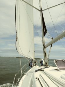 The next day, we headed out towards Camp LeJeune, only to find that there was an emergency on one of the islands, so the Figure Eight Island Bridge was closed indefinitely. It could not be lifted until the emergency was resolved. We dropped anchor for a while, but after hearing it would be several hours, we decided to head back to Wrightsville Beach, since it looked like a storm was headed our way anyways. The next morning, we departed again, this time making it to Sneads Ferry. We could not go any further, as the firing range over the ICW at Camp LeJeune was active, meaning the ICW was closed. I called and found out that the ICW would be closed until dusk, but that it was scheduled to be open all day tomorrow. I confirmed the ICW was open in the morning, and we headed out. The wind picked up as we cruised across Bogue Sound, and we raised our sails as we headed into Morehead City.