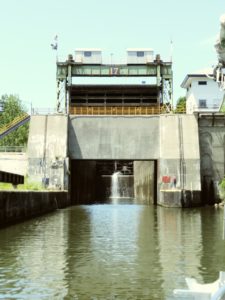 The next day, we head off towards Little Falls. Before we arrive at the dock, we enter Lock 17. With a 40 foot lift, Lock 17 is the highest lift lock on the Erie Canal and it is also unique because the entrance gate is lifted above the boat, as opposed to doors that swing open. We attempted to contact the lockmaster on the radio upon arrival. Without a response, we go ahead and enter the open lock chamber. Still unable to hail anyone, we decide to back out of the lock. It was very eerie staring up at over 40ft of concrete, knowing that all of that water is waiting on the other side. Finally the lockmaster appeared and we entered the lock. Little Falls was definitely a highlight of the Erie Canal. Besides having excellent boater’s facilities, the town was beautiful, sprawled out across the river and carved into the hillside. We enjoyed walking through the town, though most was closed on this Sunday.