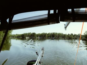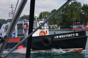 We leave early the next morning for our trip up the Detroit River. We know there will be some current against us, so we aren’t sure how long of a trip we will have to Lake St. Clair. It’s an interesting trip through downtown, so much very active industry surrounds downtown Detroit. We pass the old Boblo Island ferry dock. Chad and I share fond childhood stories from the now abandoned amusement park. Chad had read about the JW Westcott II, the only boat in the country that has its own zip code. The Westcott will deliver mail to any boat that passes by. Chad saw the boat on the banks of the Detroit River, and hailed them on the radio, asking if he could get a hat or something. To my surprise, two super nice guys jumped in the mail boat and delivered Chad a hat. They were just as excited to give Chad the hat as he was to get it. We all took pictures of the fun occasion. We motored on through downtown, and passed by Belle Isle, before finally exiting into Lake St. Clair.
