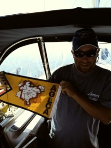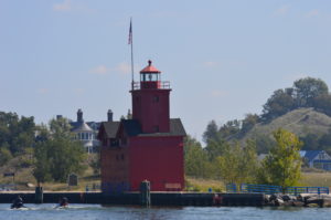 We get a late start from Grand Haven, as we are completely fogged in. I can’t even see the other side of the river. Late morning the fog lifts, and we depart. It’s still a very hazy day, and Lake Michigan is eerily like glass. As we near Port Sheldon, we know we are half way. Chad gets out our gold loop flag, hoisting it up as he removes our worn, dingy white one. The gold flag is a badge of honor you get to fly once you complete your first loop. We have a hard time spotting Big Red, as the locals affectionately call the big red lighthouse that marks the entrance to Holland harbor. And then out of the haze, we spot it. The places, the faces, the memories of the last 354 days rush past all at once. I’m so very excited to see those faces we have missed dearly. Yet I can’t help but feel a bit sad that this adventure is coming to a close as we “cross our wake” today.