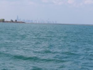 We wouldn’t see this much open water until we reached the Gulf of Mexico. Luckily we were able to sail a good part of the day, since tomorrow, our mast comes down. We won’t have it put back on until we reach Mobile, AL. That means lots and lots of motoring! We kept an eye on the horizon in front of us, waiting to see the towering sky scrapers of downtown Chicago. We were quite close to shore before we noticed the faint hint of the Sears Tower, and slowly we could make out more and more. It was a hot, hazy day on shore, and we would not get a great view of downtown today. We continued south to the Calumet River, where we are now docked awaiting a busy day tomorrow.